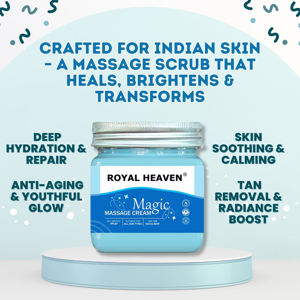 Pamper your skin with the timeless goodness of Sandalwood and Saffron, infused in a rich, nourishing cream by Royal Heaven. This luxurious massage cream deeply hydrates, soothes, and brightens your skin – giving you a natural royal glow. Perfect for both face and body massage, it revives dull skin and leaves it soft, radiant, and refreshed.